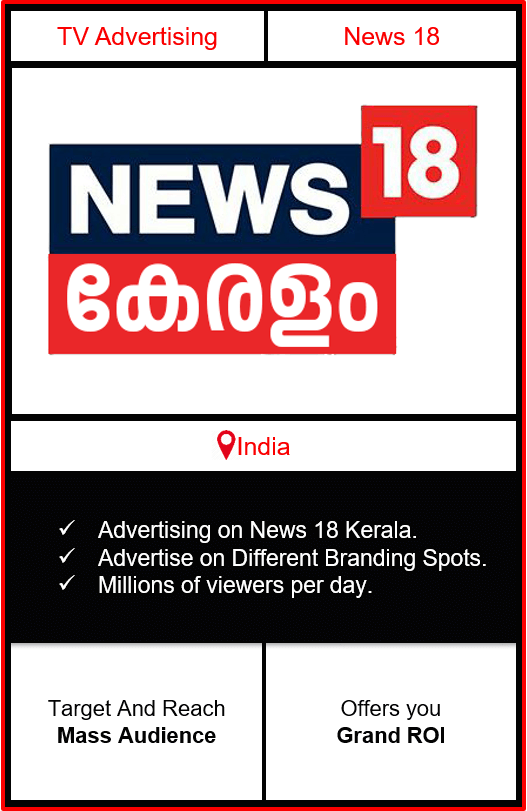 Advertising on News 18 Kerala is an exceptional way to propose your brand a strong boost in visibility and enhancing brand equity to generate more ROI. News 18 Kerala is one of the prominent and renowned news channels in the Indian Media Industry. Advertising on TV consents you to convey your brand message with motion, sounds, and sights which instantly boosts up your product, service, or business’s credibility.