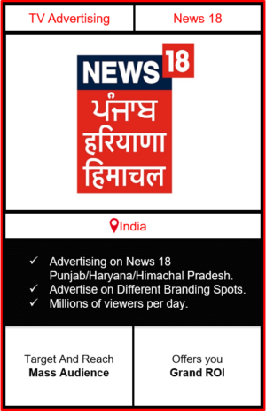 Advertising on News 18 Punjab, Haryana, And Himachal Pradesh is an exceptional way to propose your brand a strong boost in visibility and enhancing brand equity to generate more ROI. News 18 Punjab, Haryana And Himachal Pradesh is one of the prominent and renowned news channels in the Indian Media Industry. Advertising on TV consents you to convey your brand message with motion, sounds, and sights which instantly boosts up your product, service, or business’s credibility.